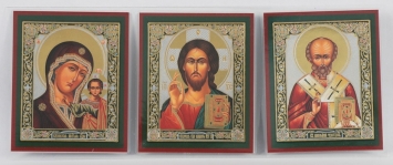Икона в жесткой ламинации складень-тройник 7х18 двойное тиснение Спаситель-Казанская БМ-Н.Чудотворец 10