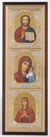 Икона в киоте 20х70 сложный, темпера, риза-рамка объемная, открытая, золочение, никелирование Спаситель 1- Казанская БМ 1- Семистрельная 1