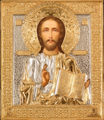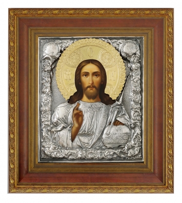 Икона живописная в киоте 24х30 масло, риза №76, черненое серебрение, киот №22 Спаситель