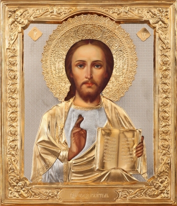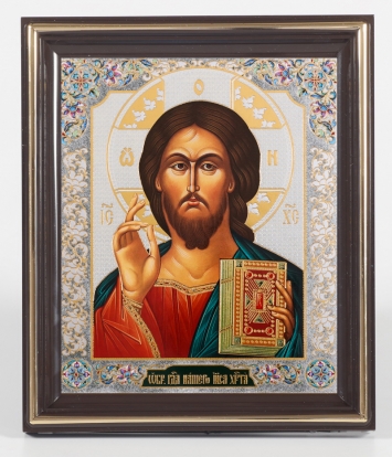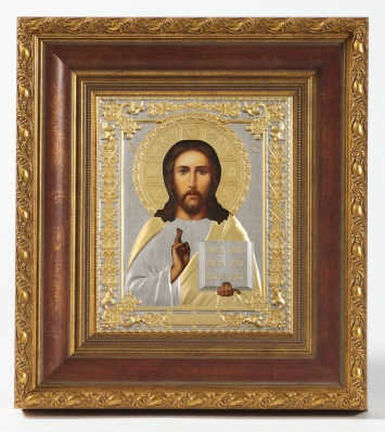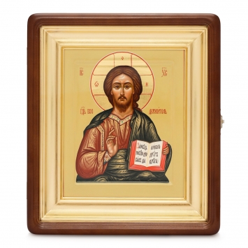 Икона живописная в киоте 24х30 масло, риза №76, матовое глянцевое золочение, киот №22 Спаситель