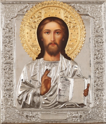 Икона живописная в киоте 24х30 масло, риза №36, черненое серебрение, киот №22 Спаситель