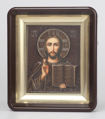 Икона в пластмассовой рамке Киот 11х13 латун. подрамник риза патинированная Спаситель