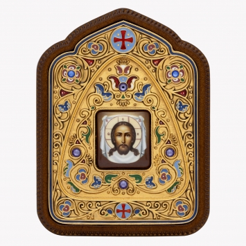Икона настольная №156 гальванопластика, эмаль, деколь, в деревянной рамке / золочение / Спас Нерукотворный