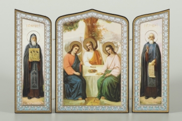 Складни деревянные 18х24 трехстворчатые, двойное тиснение, арочные, в упаковке Троица 3 + Сергий Радонежский + Серафим Саровский