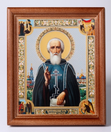 Икона в деревянной рамке 11х13 Набор с Днем Ангела, двойное тиснение Сергий Радонежский (с клеймами)