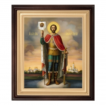 Икона в киоте 18х24 сложный, изображение на пластике Александр Невский рост.