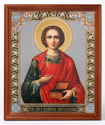 Икона в деревянной рамке №1 18х24 двойное тиснение Пантелеимон