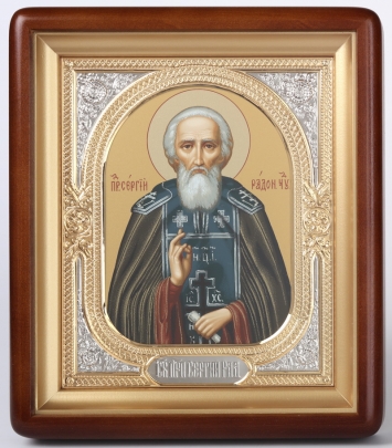 Икона в киоте 18х24 фигурный, темпера, риза-рамка объемная, открытая, золочёная, никелирование Сергий Радонежский 1