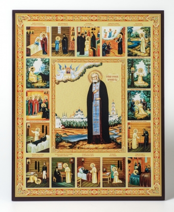 Икона на доске 40х50 объемная печать, лак Серафим Саровский с житием