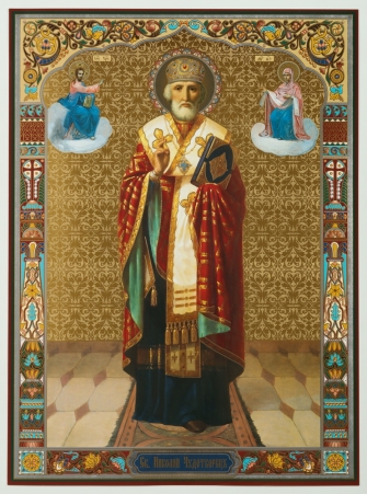 Икона на оргалите №1 30х40 двойное тиснение Николай Чудотворец с предстоящими (рост.)