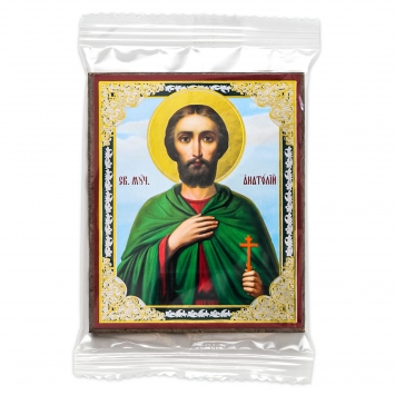 Икона на деревянном планшете 6х9 двойное тиснение, аннотация, упаковка Анатолий 2