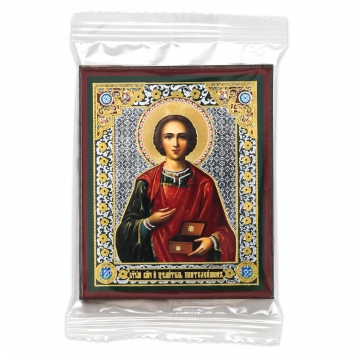 Икона на деревянном планшете 6х9 двойное тиснение, аннотация, упаковка Пантелеимон