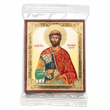 Икона на деревянном планшете 6х9 двойное тиснение, аннотация, упаковка Александр Невский 3
