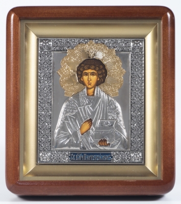 Икона на деревянном планшете 6х9 тиснение, аннотация, упаковка Пантелеимон