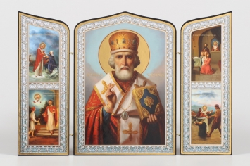 Складни деревянные 19х28 трёхстворчатые, двойное тиснение, фигурные, в упаковке Николай Чудотворец