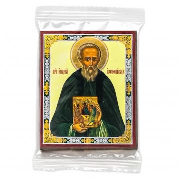 Икона на деревянном планшете 6х9 двойное тиснение, аннотация, упаковка Андрей Рублев