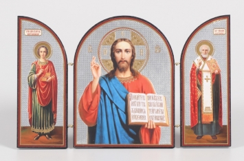 Складни деревянные 12х18 трехстворчатые, двойное тиснение, арочные, в упаковке Пантелеимон - Спаситель - Николай Чудотв. №3