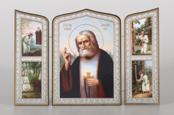Складни деревянные 19х28 трёхстворчатые, двойное тиснение, фигурные, в упаковке Серафим Саровский