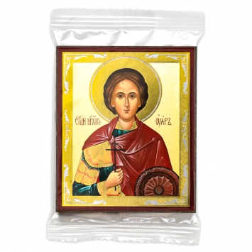Икона на деревянном планшете 6х9 двойное тиснение, аннотация, упаковка Родион