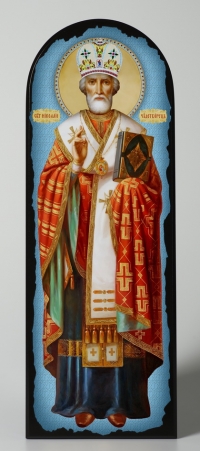 Икона на МДФ 18х50 арочная, объёмная печать, лак Николай Чудотворец на голубом фоне