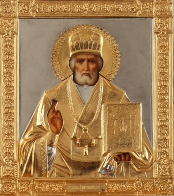 Икона в жесткой ламинации 8х11 с оборотом, двойное тиснение, высечка Николай Чудотворец (ростовой)