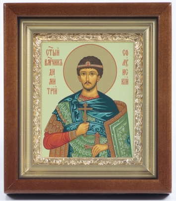 Икона в киоте 11х13 сложный, темпера, рамка золочёная Димитрий Солунский