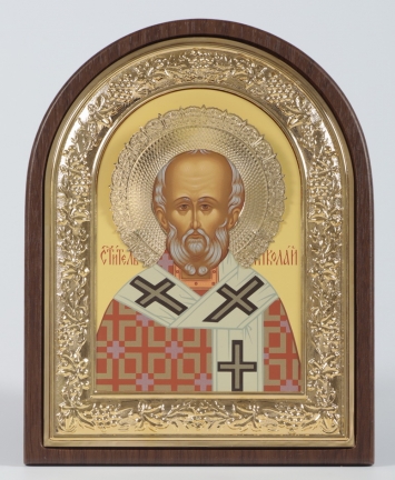 Икона в ризе 18х24 арочная, планшет, рамка, венчик золочёные, темпера, упаковка Николай Чудотворец