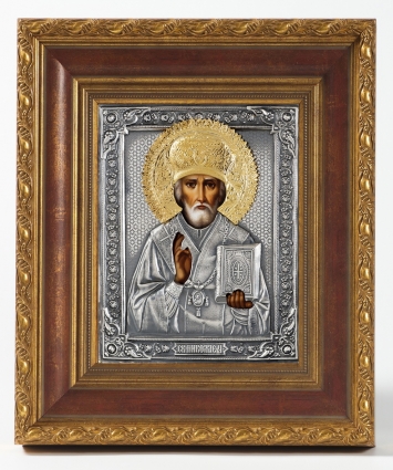 Икона живописная в серебряном окладе 40*50 / киот / Николай Чудотворец (УИН)