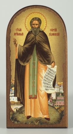 Икона на дереве 11х22 арочная, канвас, упаковка Сергий Радонежский (с житием)