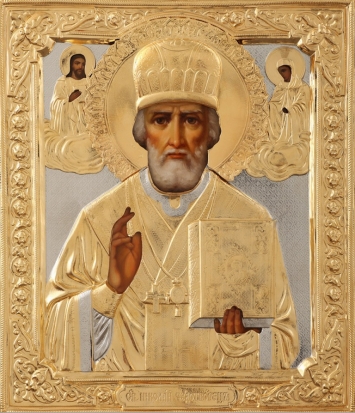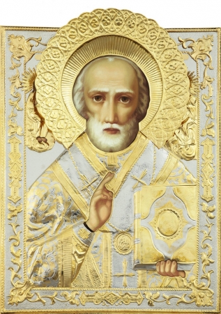 Икона в киоте 18х24 фигурный, темпера, риза-рамка объемная, открытая, золочёная, никелирование Николай Чудотворец 1