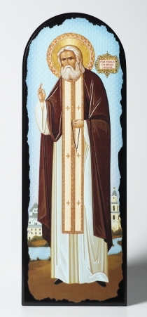 Икона на МДФ 18х50 арочная, объёмная печать, лак Серафим Саровский (голубой фон)