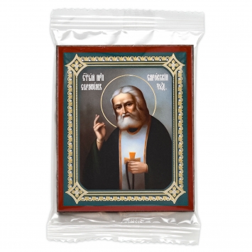 Икона на деревянном планшете 6х9 двойное тиснение, аннотация, упаковка Серафим Саровский 7