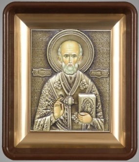 Икона в пластмассовой рамке Киот 11х13 латун. подрамник риза патинированная Николай Чудотворец