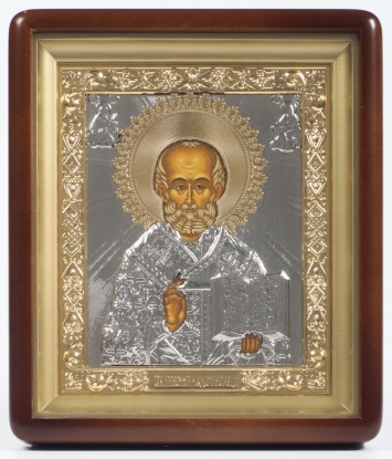 Икона в киоте 18х24 фигурный, темпера, риза объёмная, закрытая, частично золочёная Николай Чудотворец