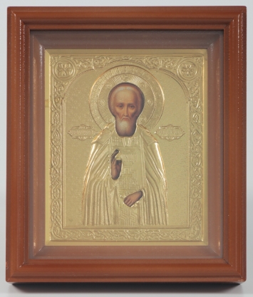 Икона в деревянной рамке 11х13 Набор с Днем Ангела, двойное тиснение Сергий Радонежский