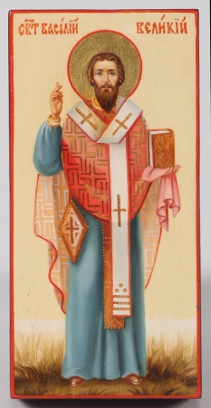 Икона живописная на доске 4х8 масло, золоченый нимб Василий Великий