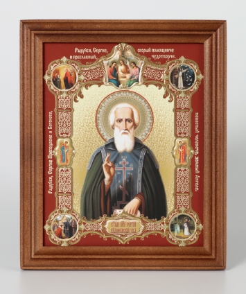 Икона в деревянной рамке 13х18 конгрев, плёнка (без стекла) Сергий Радонежский (с клеймами)
