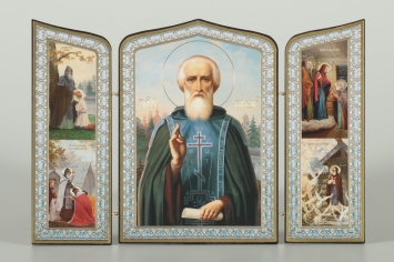 Складни деревянные 19х28 трёхстворчатые, двойное тиснение, фигурные, в упаковке Сергий Радонежский (с клеймами)
