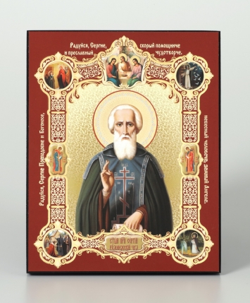 Икона на деревянном планшете 13х18 конгрев, плёнка (18мм) Сергий Радонежский (с клеймами)