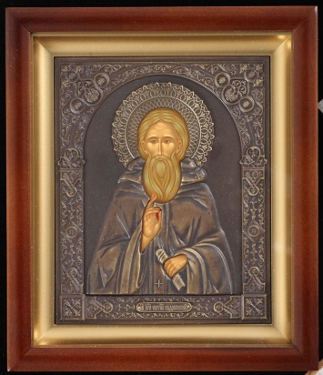 Икона в киоте 12х14 сложный №2 темпера, риза патинированая Сергий Радонежский