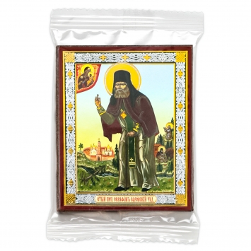 Икона на деревянном планшете 6х9 двойное тиснение, аннотация, упаковка Серафим Саровский (ростовой) 3