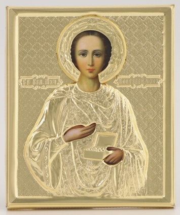 Икона в киоте 15х19 сложный, темпера, риза объёмная, никель, золочение Пантелеимон