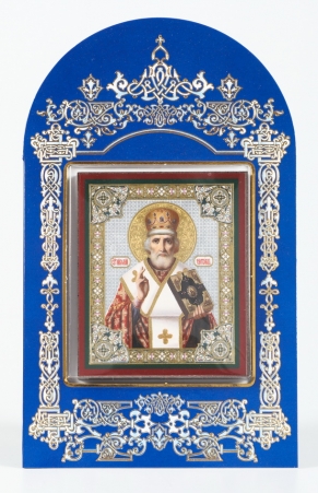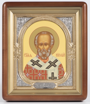 Икона в киоте 18х24 фигурный, темпера, риза-рамка объемная, открытая, золочёная, никелирование Николай Чудотворец