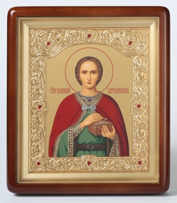 Икона в киоте 18х24 фигурный, темпера, рамка фигурная, золочёная Пантелеимон 1
