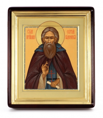 Икона живописная на доске в киоте 30х40 темпера, золоченый нимб, ковчег, киот №1 Сергий Радонежский