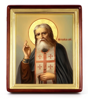 Икона живописная на доске в киоте 30х40 масло, золоченый нимб, киот №1 Серафим Саровский