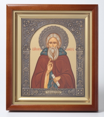 Икона в киоте 15х19 сложный, темпера, венчик, рамка фигурная, патинированая Сергий Радонежский (золотой фон)
