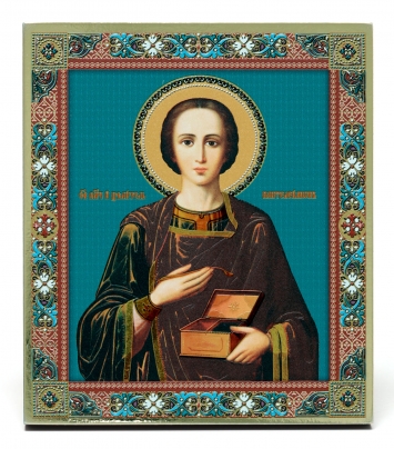Икона на доске 13х15 золоченое покрытие, объёмная печать, лак Пантелеимон