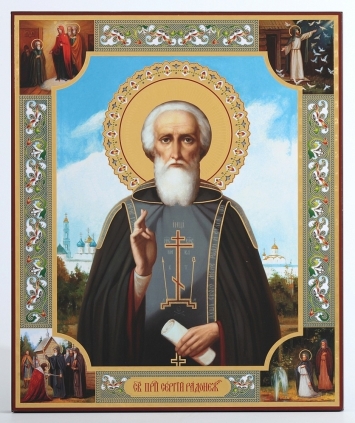 Икона на деревянном планшете 30х40 тиснение, ДСП, ПВХ Сергий Радонежский (с клеймами)