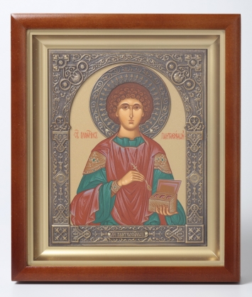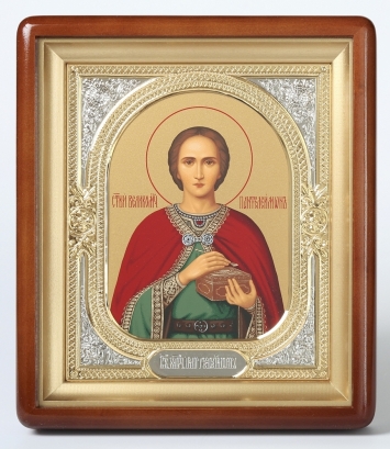Икона в киоте 18х24 фигурный, темпера, риза-рамка объемная, открытая, золочёная, никелирование Пантелеимон 1 Вы используете устаревший браузер, который создает угрозу безопасности использования сайта.